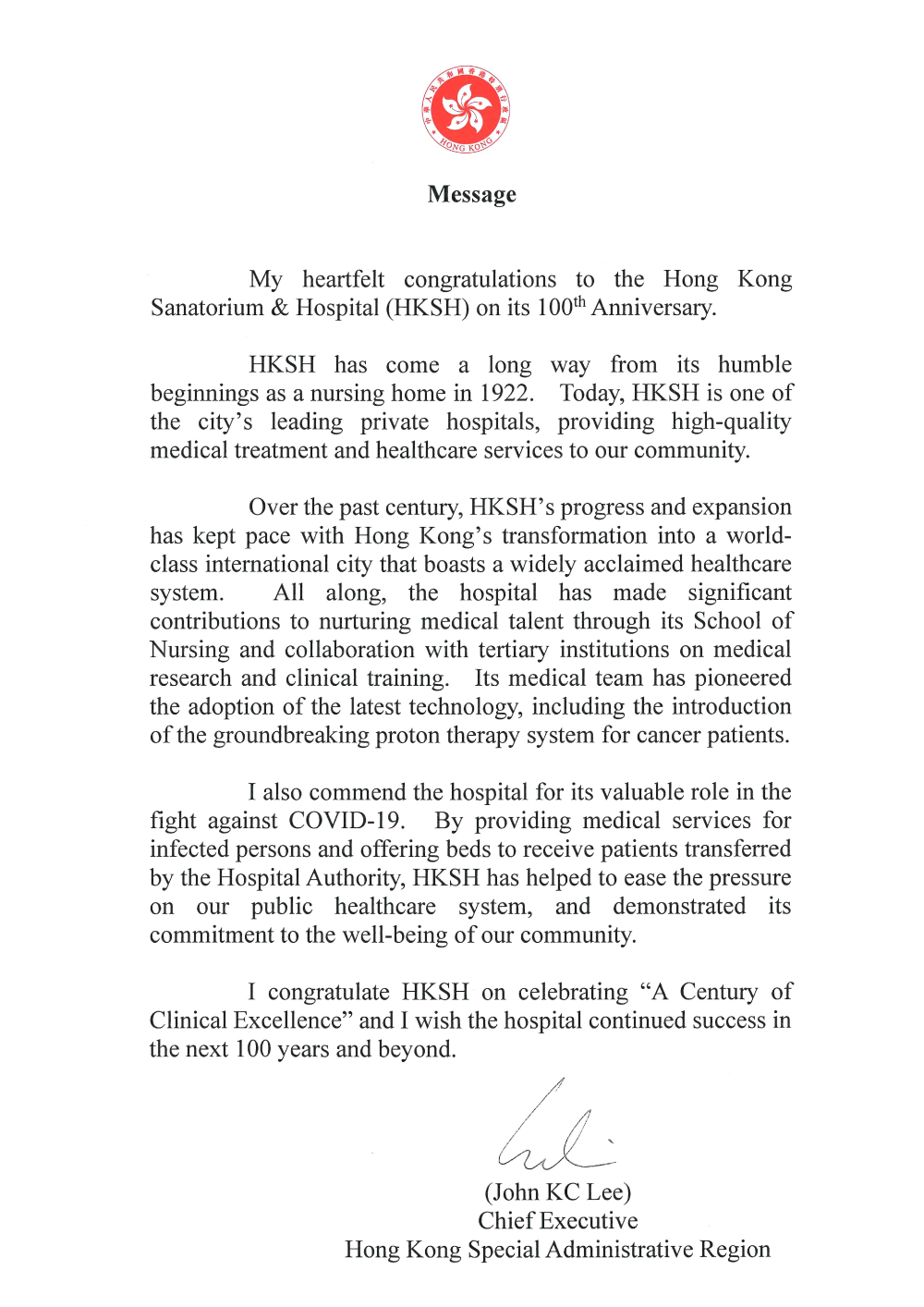 I congratulate the Hong Kong Sanatorium & Hospital on the occasion of 100th Anniversary celebration. I celebrate the rich history of the hospital for offering quality medical services to the community of Hong Kong over the years. More importantly, I celebrate the dedication and commitment of all who work in it bringing with them the skill, sympathy and resilience. I celebrate the hospital of becoming a beacon of love and hope for so many people who go there for care.