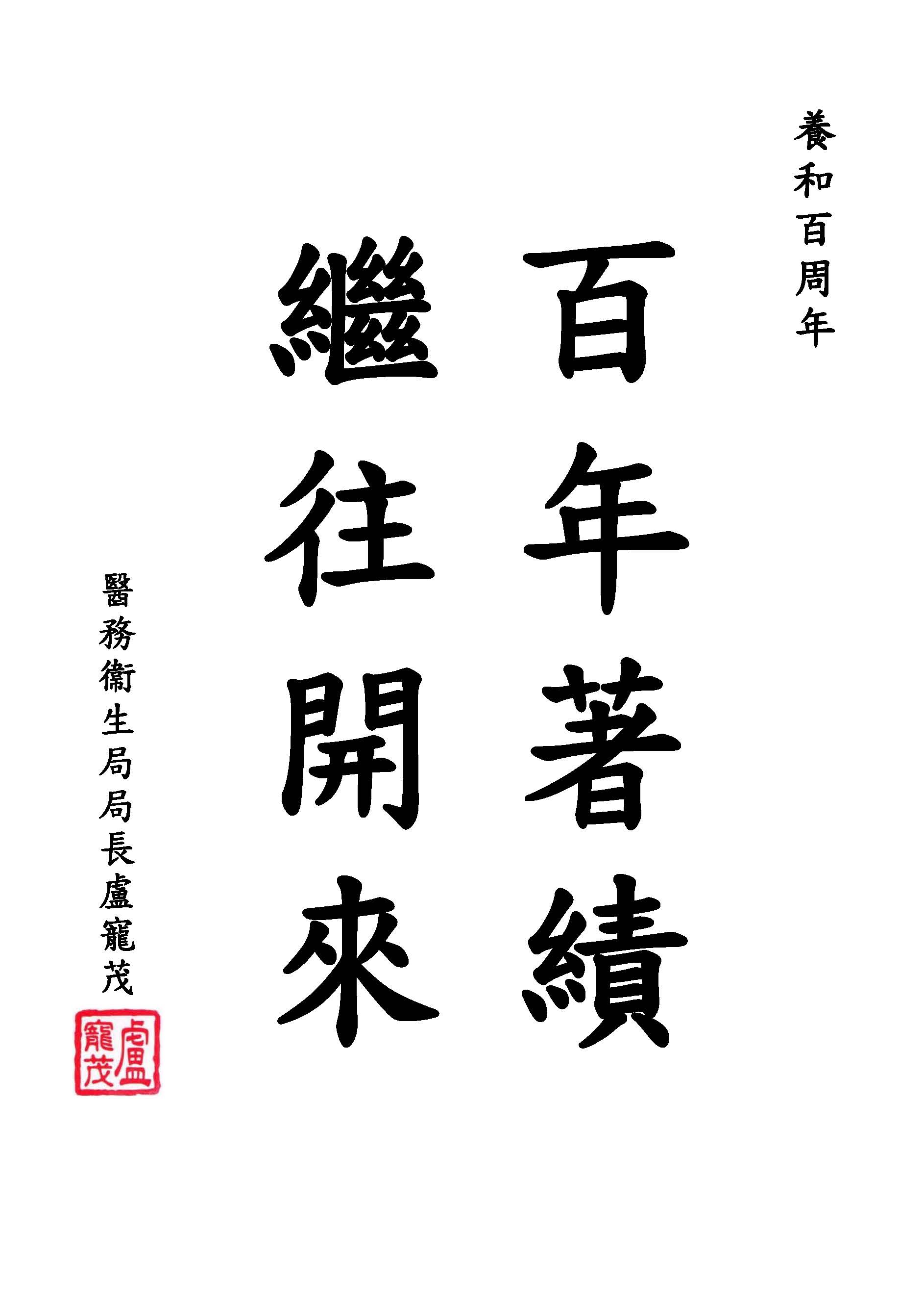 On this auspicious occasion of celebrating the 100th anniversary of the Hospital, I would like to convey my sincerest wishes for continued success in “patient care”, good governance, and exemplary service to the Hong Kong community long into the future.